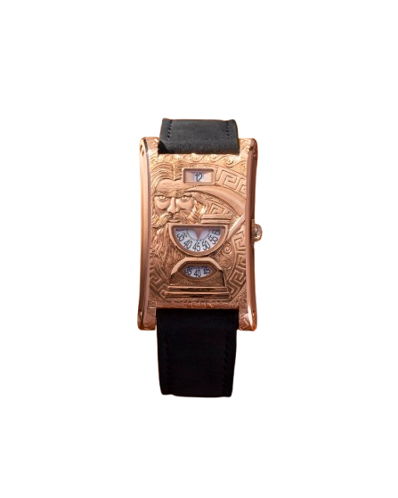 The choice of 5N gold for the case and pin buckle ensures material consistency and durability. The strap is crafted from black nubuck leather, selected for its tactile quality and aesthetic complement to the gold case. The integration of the Greek meander pattern from the case onto the strap demonstrates a holistic design approach, ensuring all components are technically and thematically aligned. Even the flattened onion crown is a calculated ergonomic choice, providing functional winding and setting within the watch’s constrained rectangular profile.